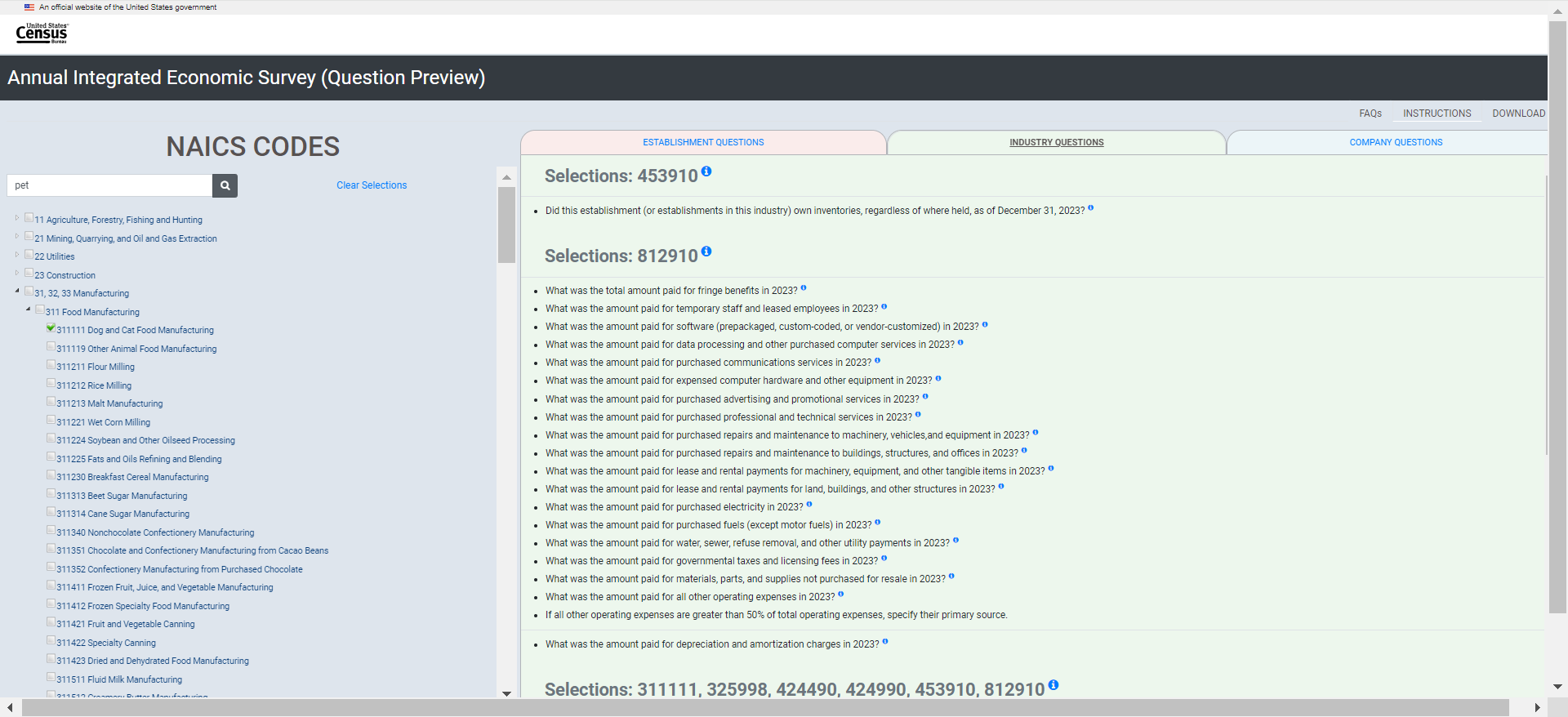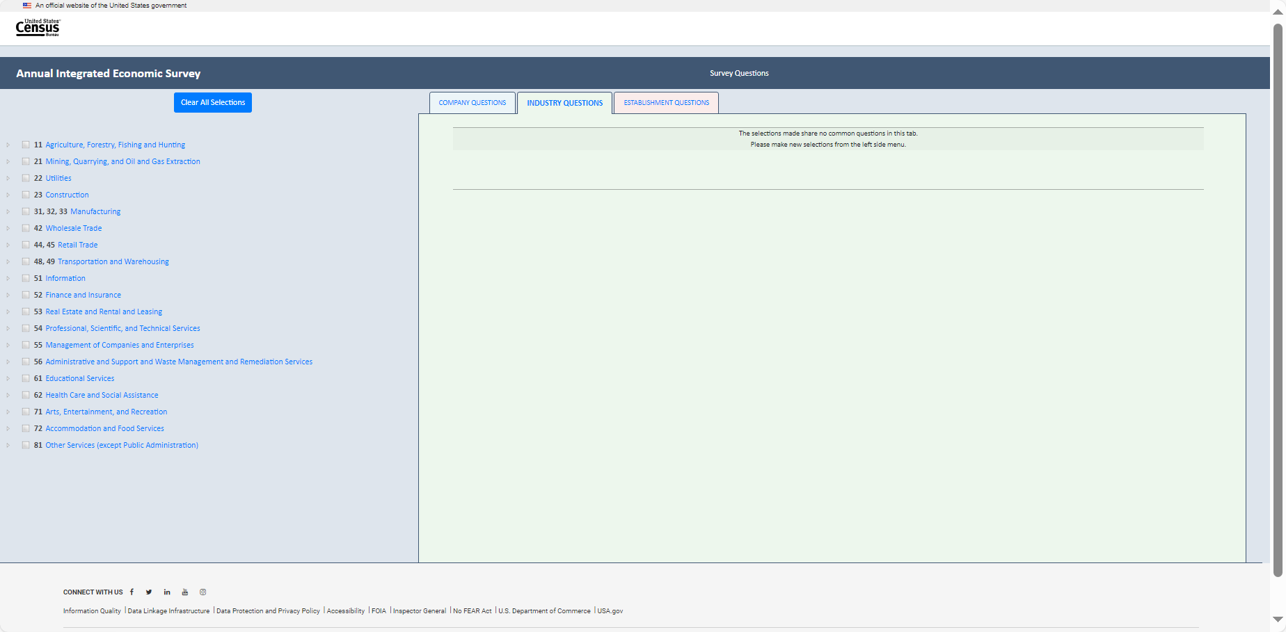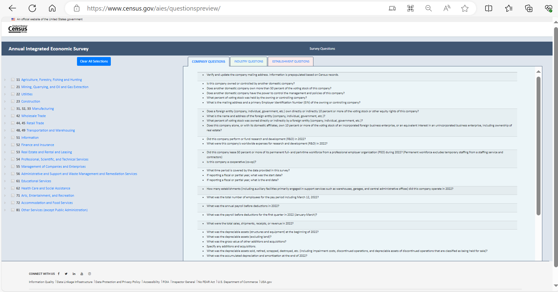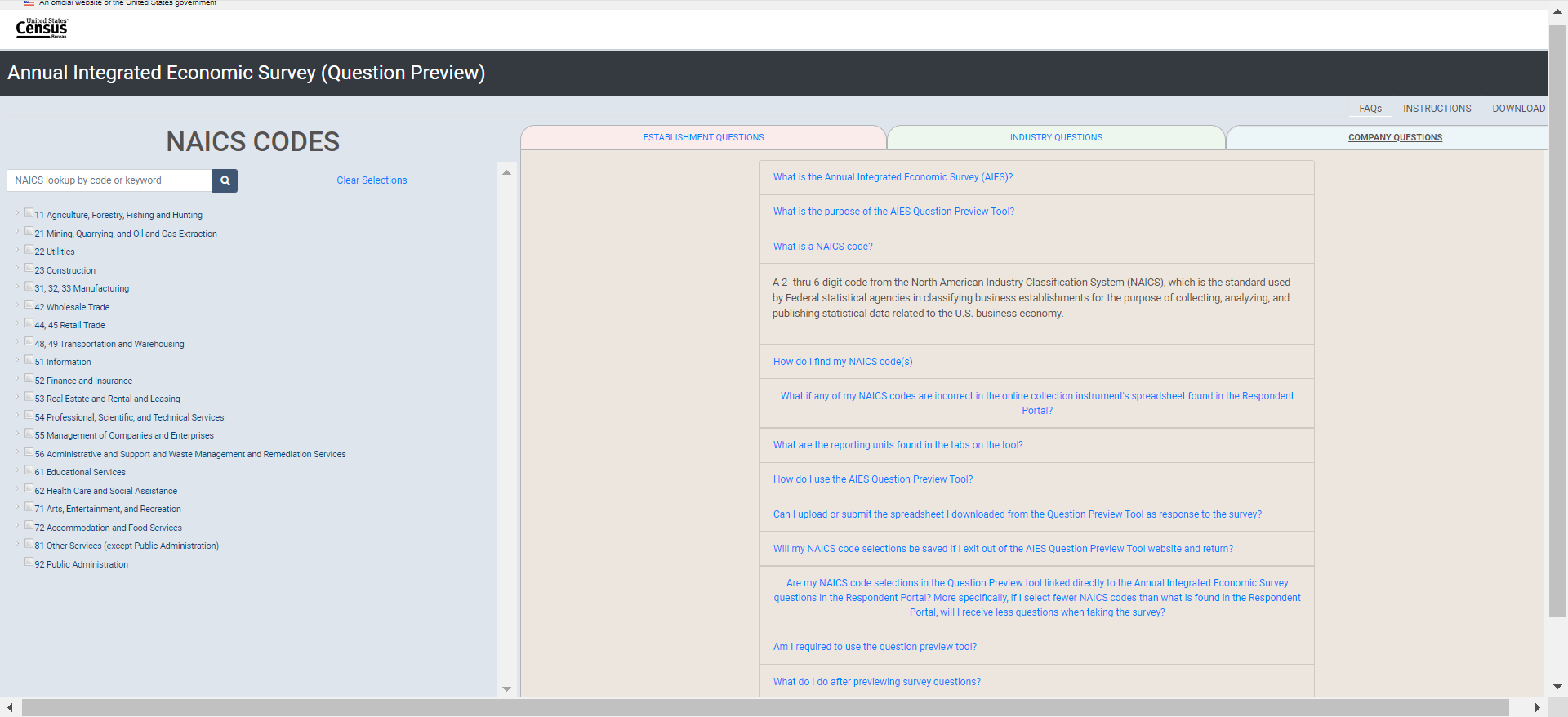 Establishment survey respondents often rely on a survey preview to support response. However, there is no designated survey form for the AIES as questions are specific to a company’s industry (or industries). As such, the Census Bureau developed an interactive content selection tool for previewing questions specific to a company’s assigned North American Industry Classification System (NAICS) code(s) to support response to the AIES.