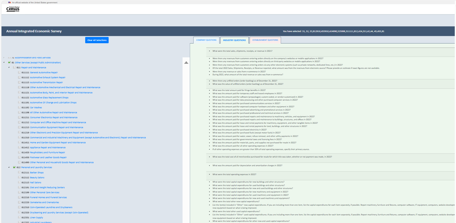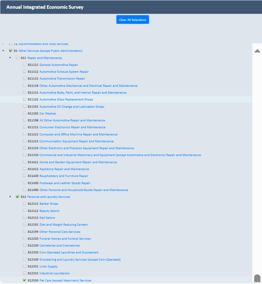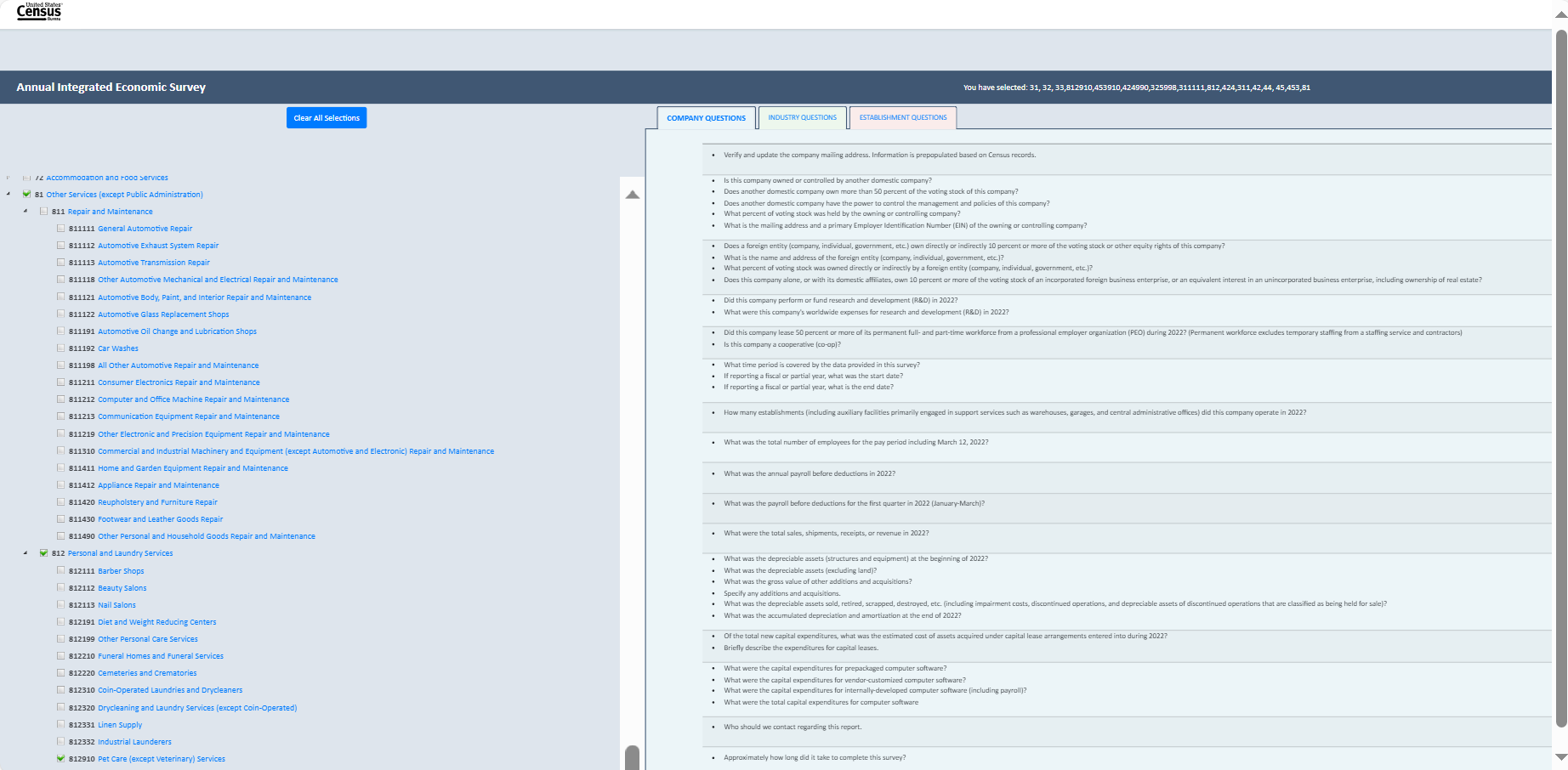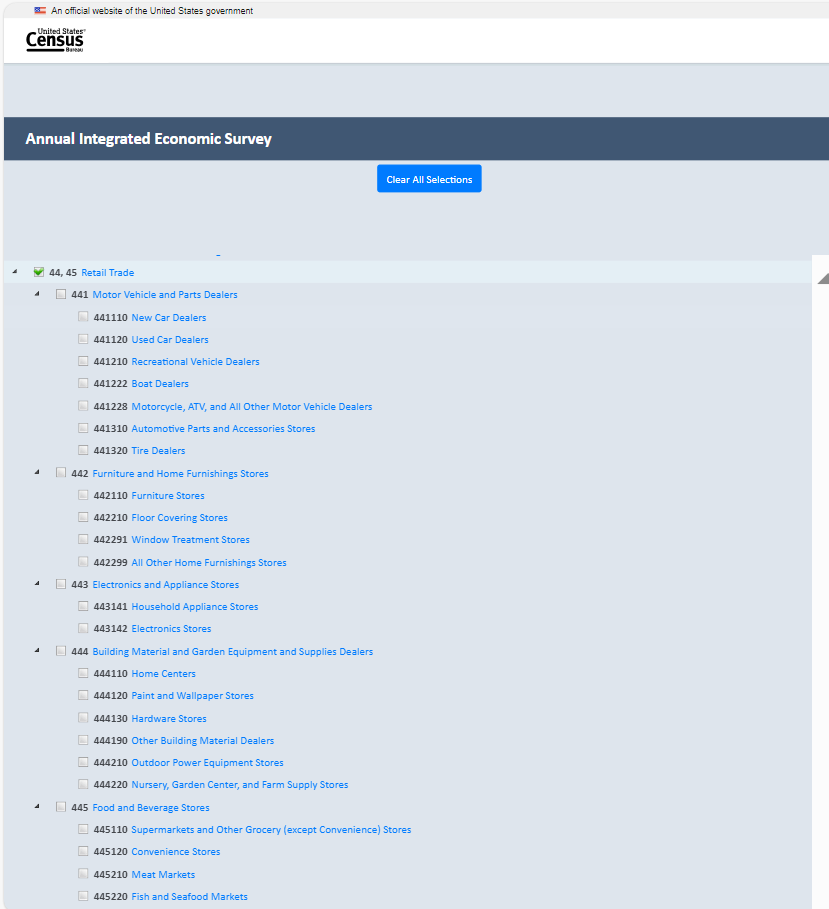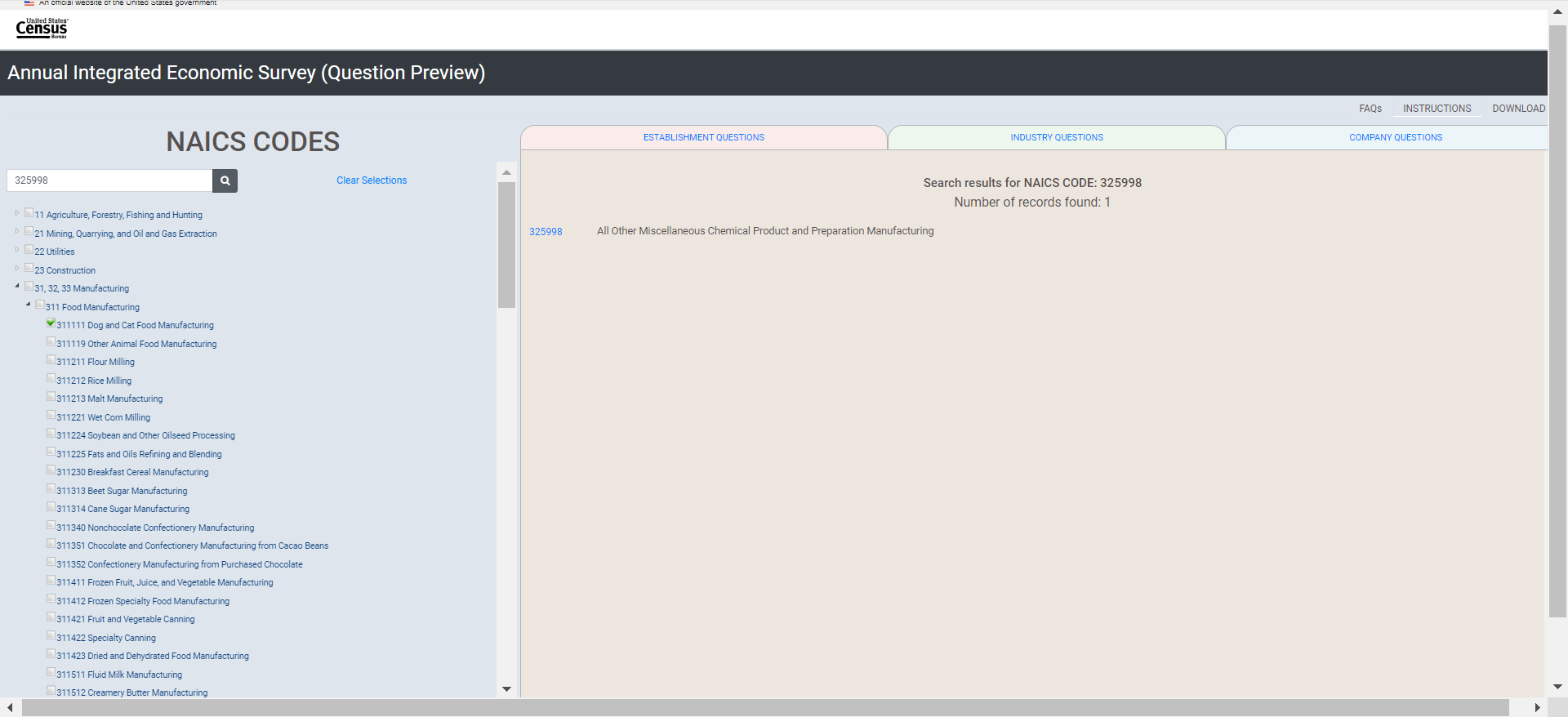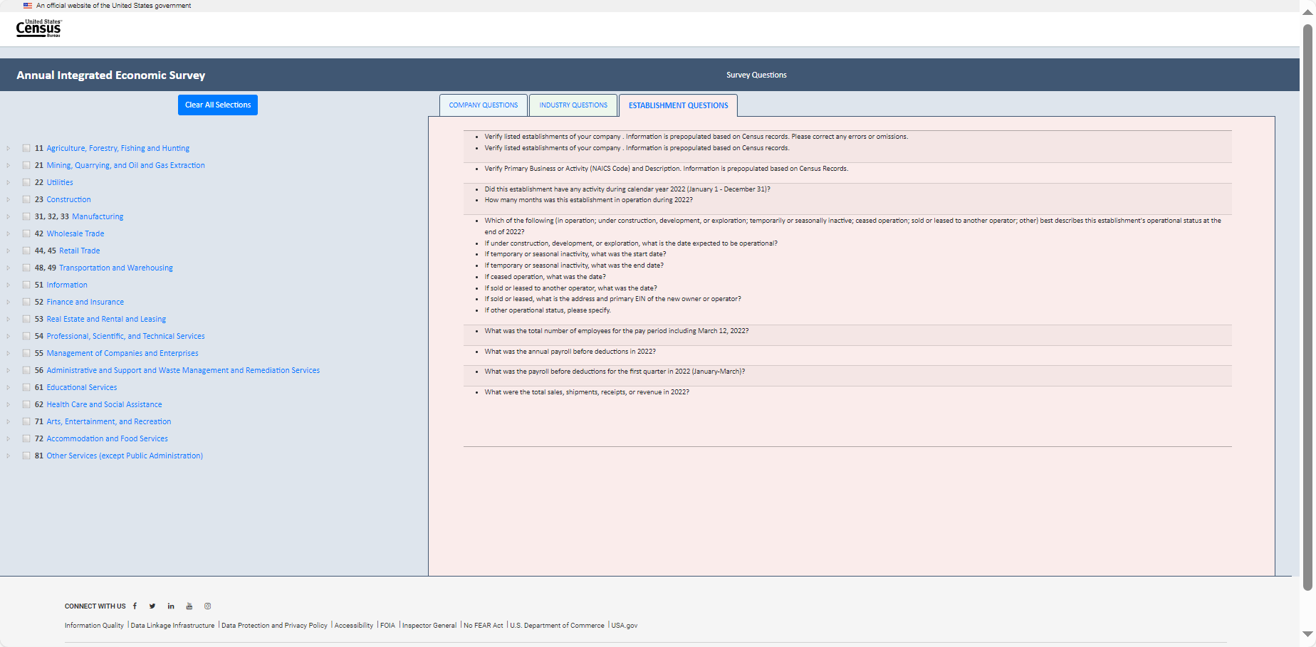 Establishment survey respondents often rely on a survey preview to support response. However, there is no designated survey form for the AIES as questions are specific to a company’s industry (or industries). As such, the Census Bureau developed an interactive content selection tool for previewing questions specific to a company’s assigned North American Industry Classification System (NAICS) code(s) to support response to the AIES.