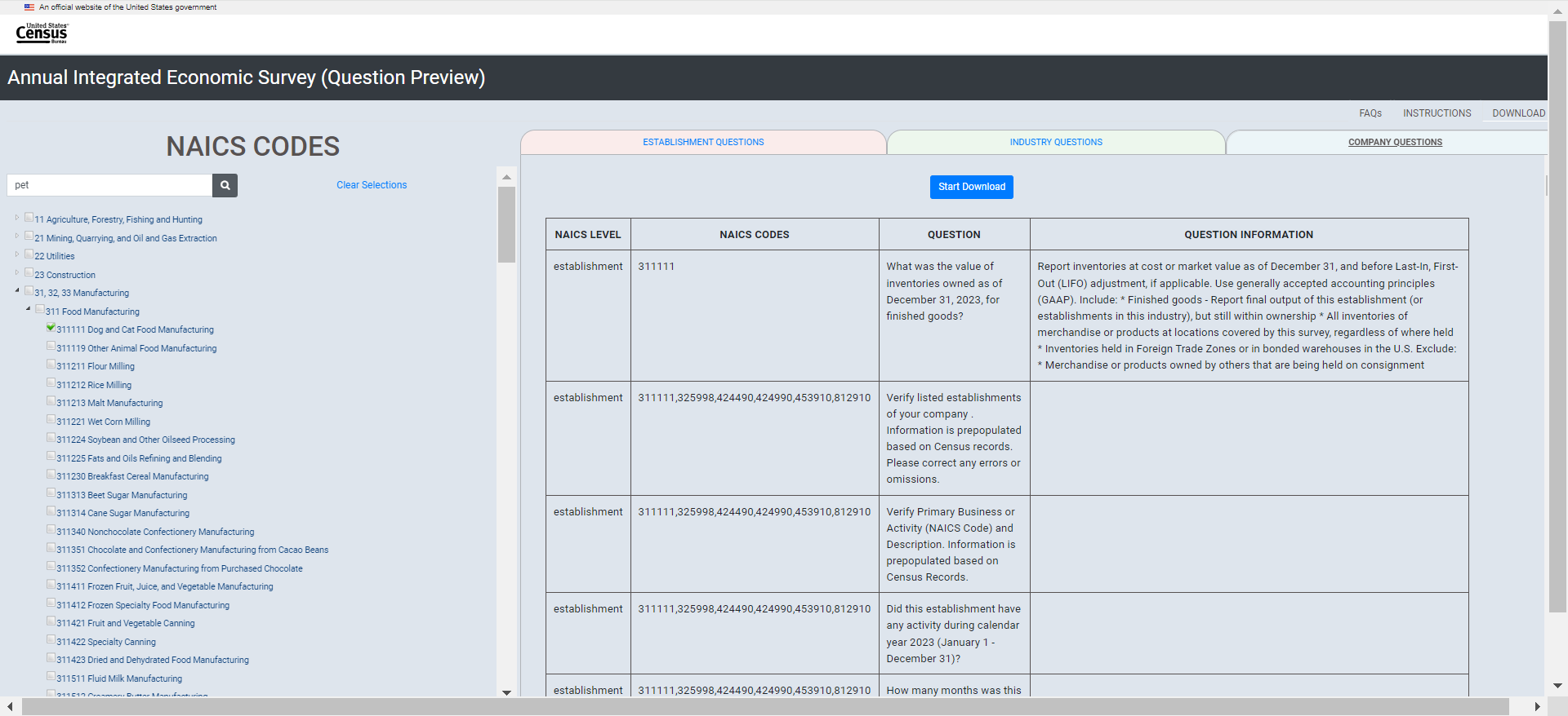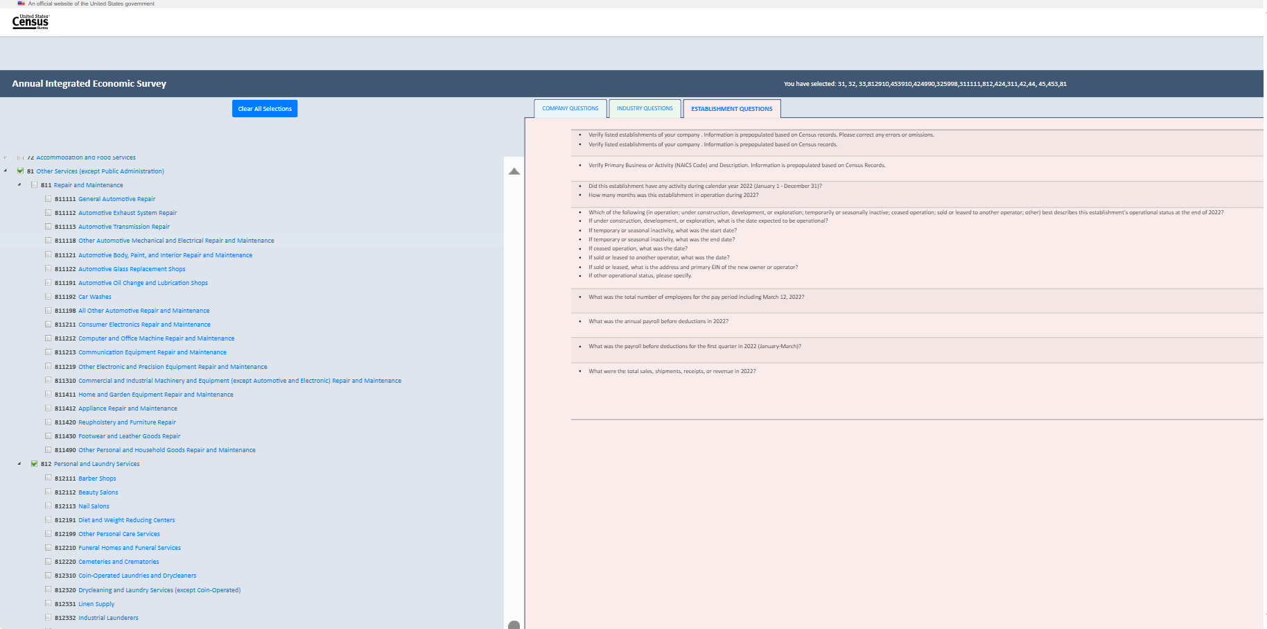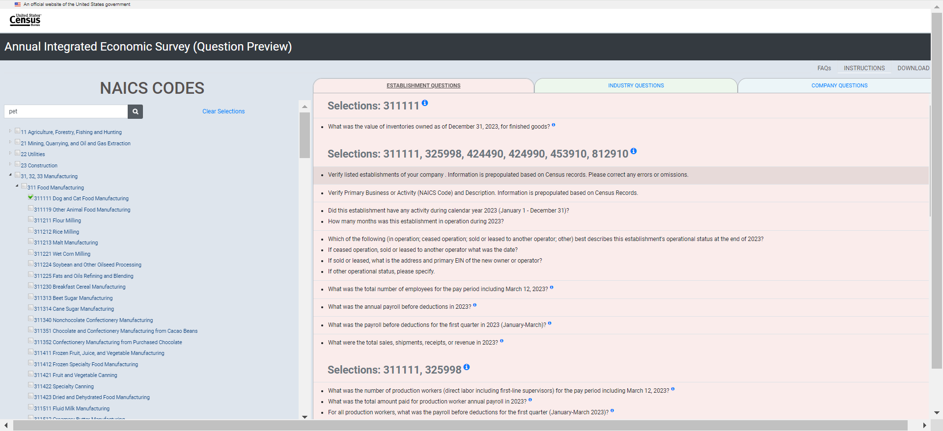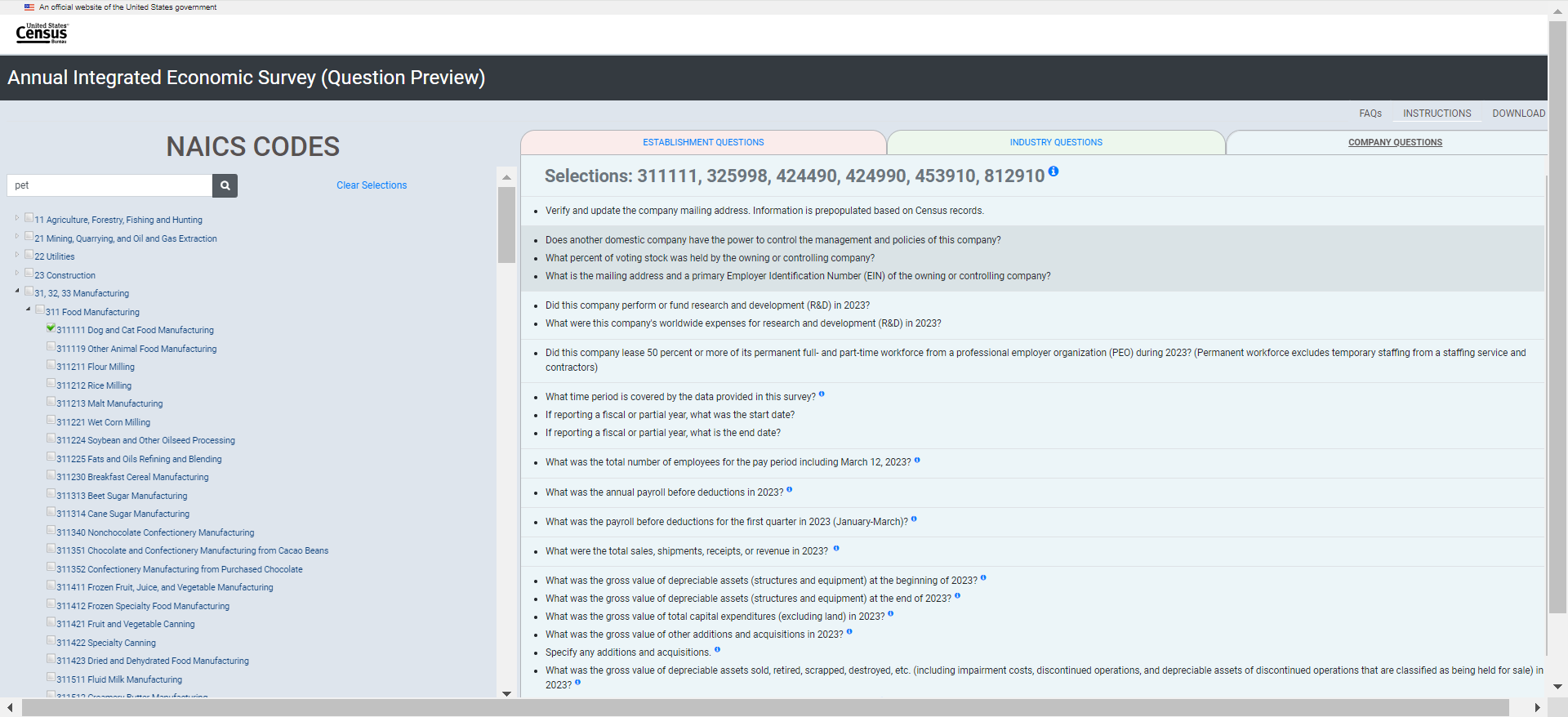 Establishment survey respondents often rely on a survey preview to support response. However, there is no designated survey form for the AIES as questions are specific to a company’s industry (or industries). As such, the Census Bureau developed an interactive content selection tool for previewing questions specific to a company’s assigned North American Industry Classification System (NAICS) code(s) to support response to the AIES.