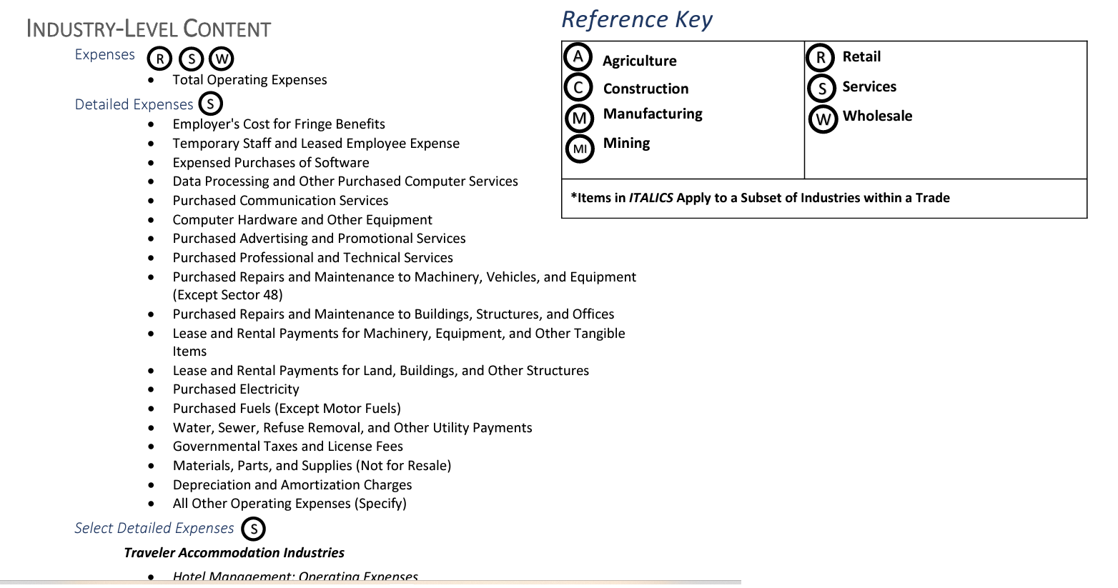 Also on the AIES website, respondents could access the AIES Content Summary. This is a PDF compendium of all of the topics within the AIES instrument, across all industries. It does not include the actual question text, but rather, the general question topics with an indication of the in-scope industries for those topics. For example, the Content Summary may note that there are questions on total operating expenses, and even that those questions are tailored for firms in retail, wholesale, and services, but not the actual questions collecting total operating expenses. See Figure 12 for a screenshot of the AIES Content Summary.