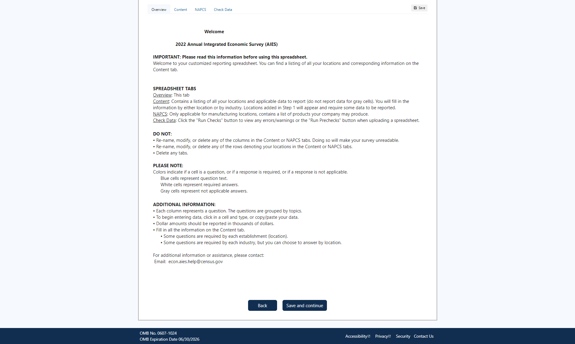 The Phase III Instrument also featured a response spreadsheet, either ‘online’ – contained entirely within the web survey browser – or ‘downloaded’ – a bespoke Excel spreadsheet respondents could download, fill out, and then upload back to the survey platform. Regardless of the chosen mode of response, the spreadsheet contained an “Overview” tab that provided additional detailed information about responding by spreadsheet. See Figure 10 for a screenshot of the Overview Tab for the online spreadsheet.