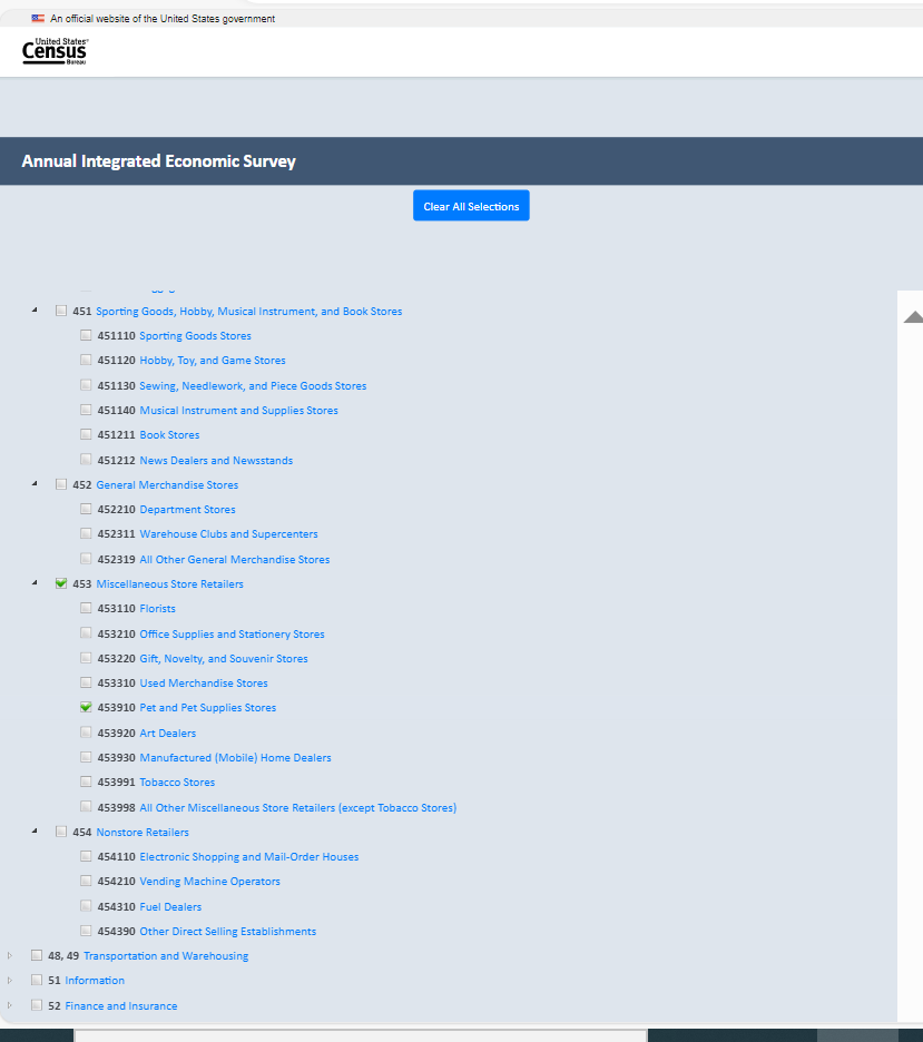 Then searching for NAICS 453910 (Pet and Pet Supplies Stores) using the keyword search “pet”:
