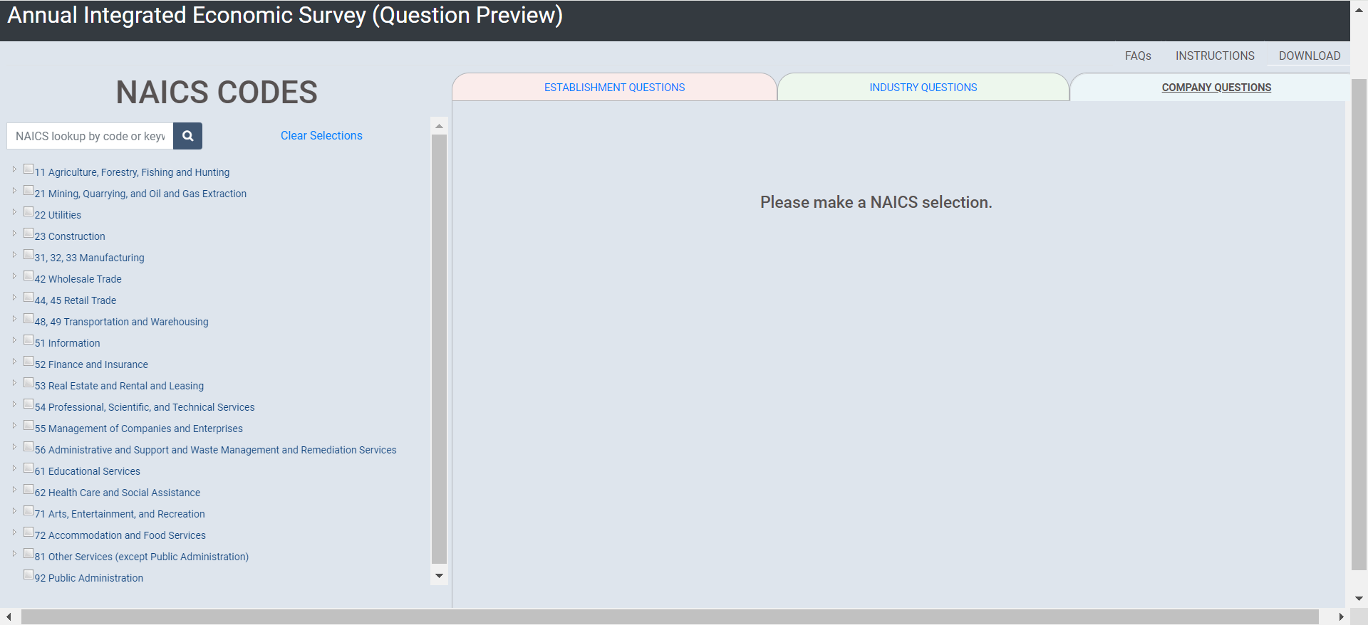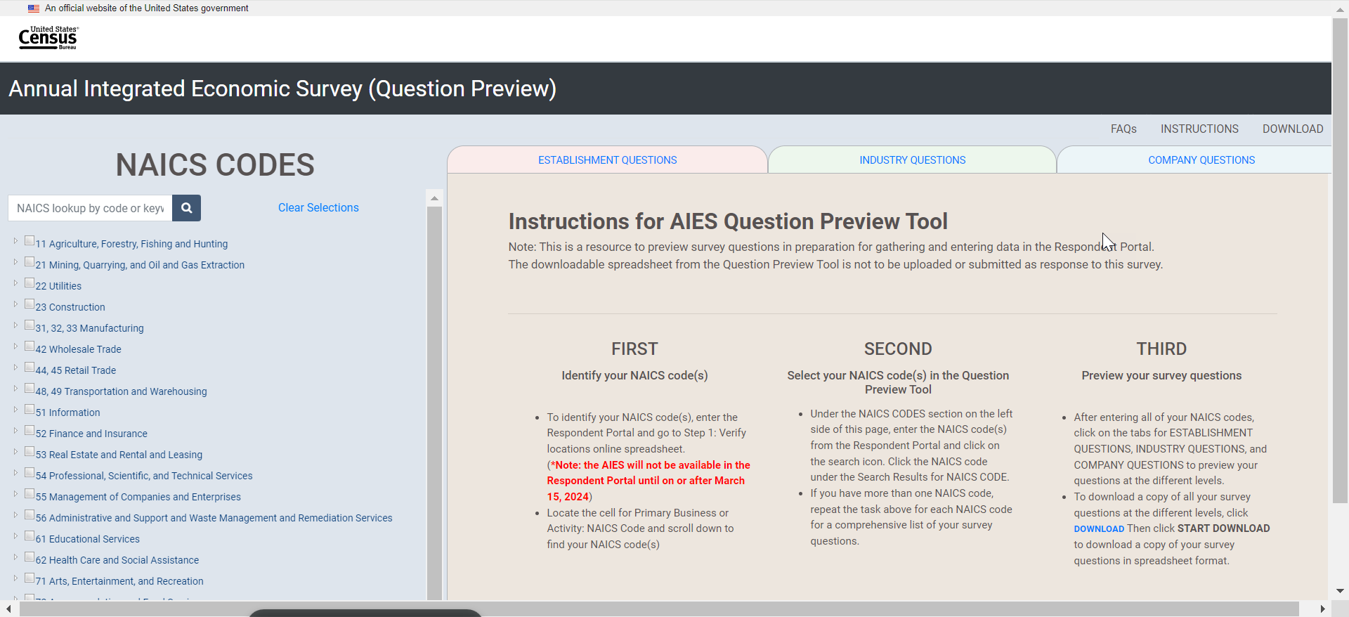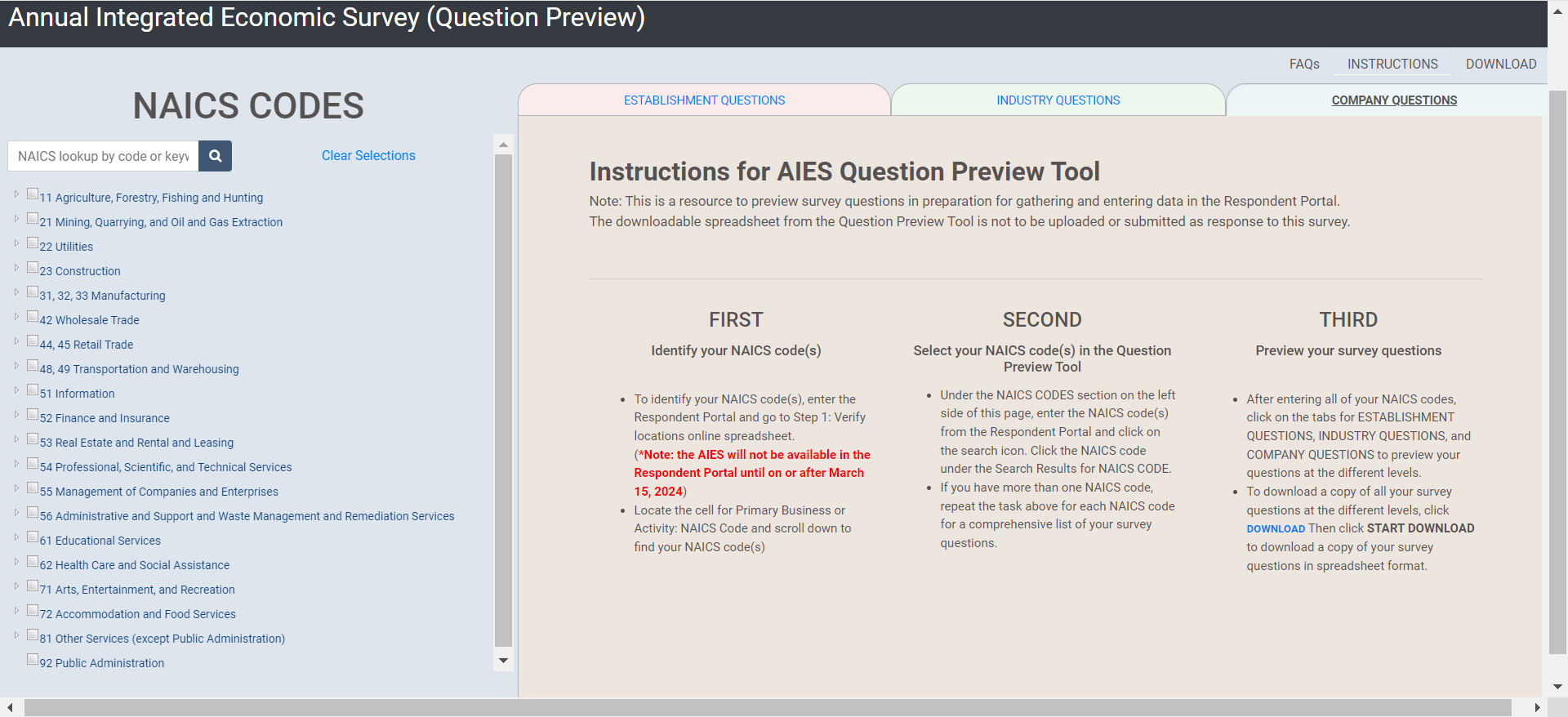 [Show the following instructions to the respondent via Qualtrics (using the same link provided for the consent form)]: This is the Interactive Question Preview Tool for the Annual Integrated Economic Survey. This tool will allow users to select their type of business operation and view the question collected at the company, industry, and establishment or location levels. This tool is NOT to be uploaded with responses in the respondent portal or submitted to the Census Bureau for response to the AIES. Instead, this is to be used only as a tool for respondents to preview survey questions that are specific to their businesses.