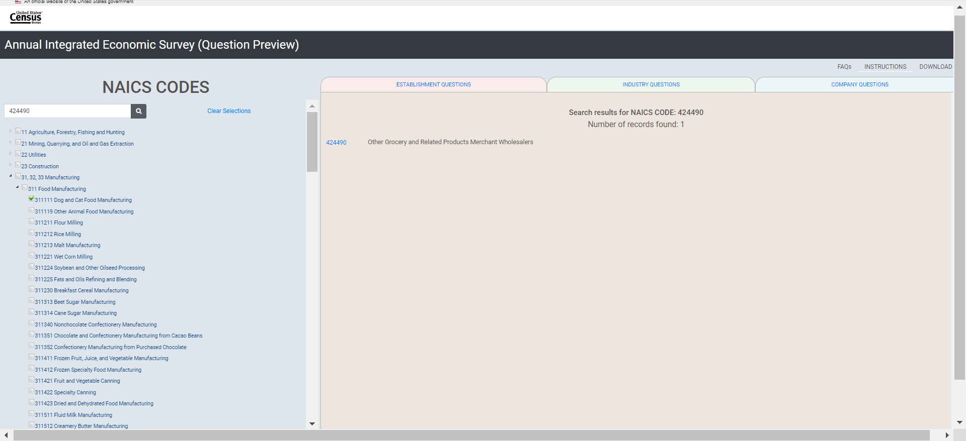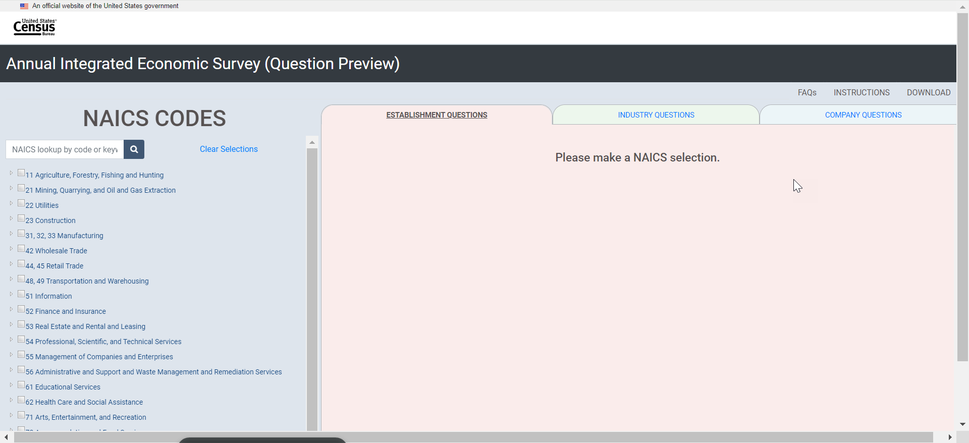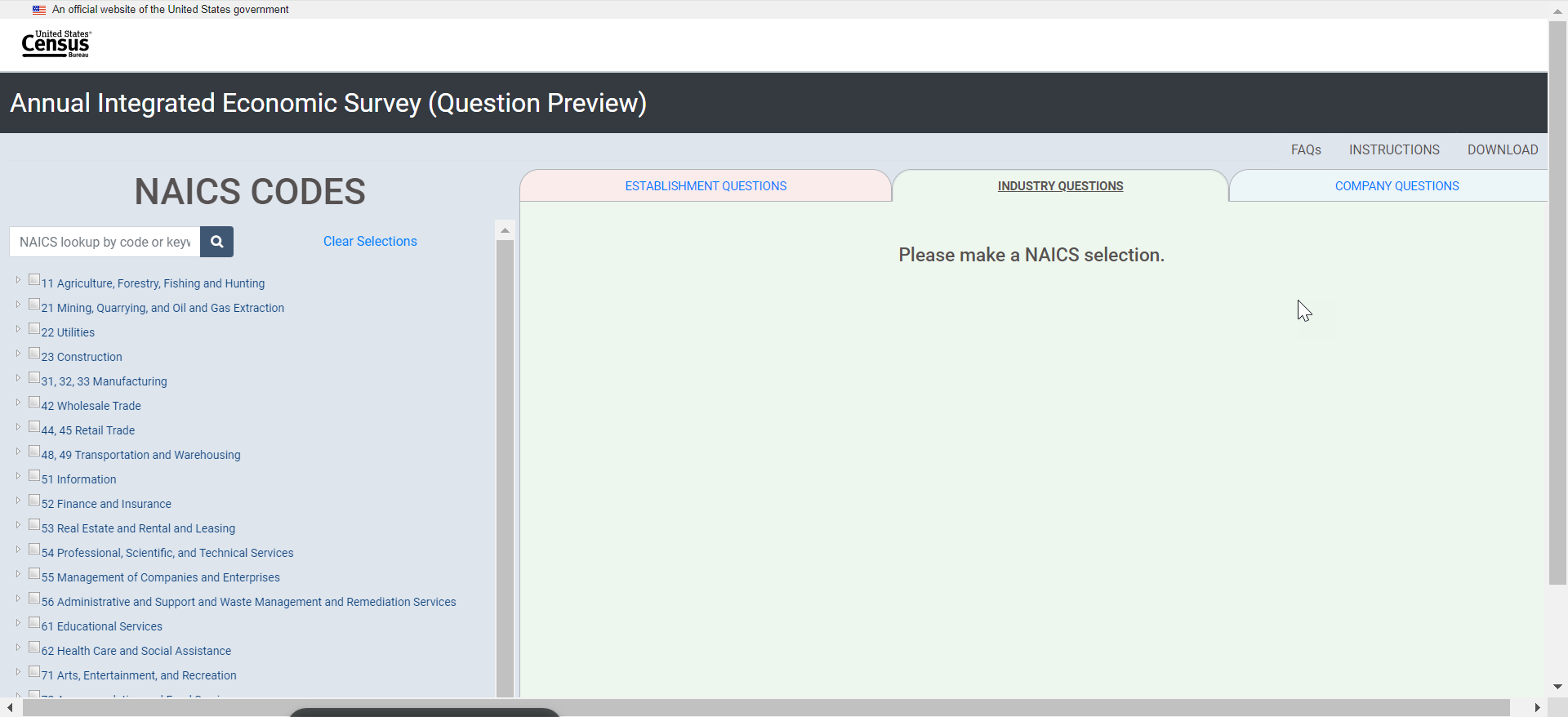 [Show the following instructions to the respondent via Qualtrics (using the same link provided for the consent form)]: This is the Interactive Question Preview Tool for the Annual Integrated Economic Survey. This tool will allow users to select their type of business operation and view the question collected at the company, industry, and establishment or location levels. This tool is NOT to be uploaded with responses in the respondent portal or submitted to the Census Bureau for response to the AIES. Instead, this is to be used only as a tool for respondents to preview survey questions that are specific to their businesses.