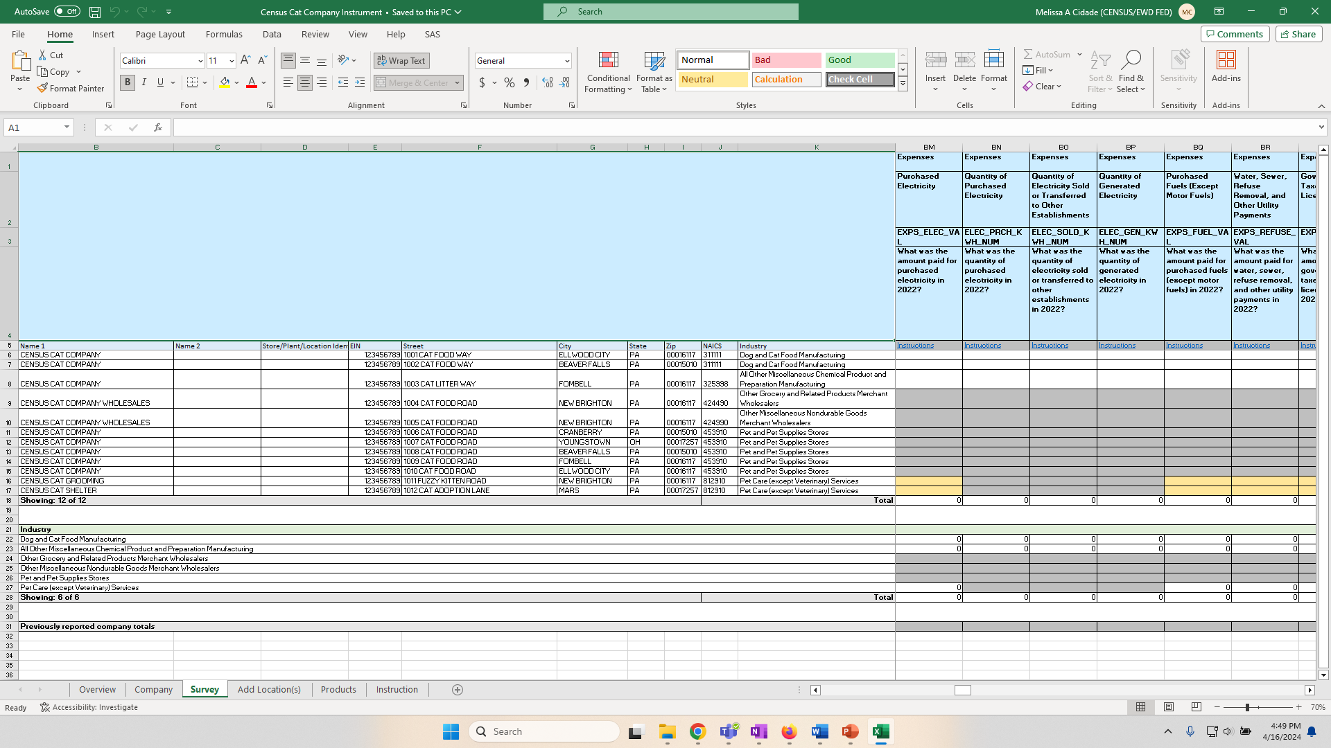 Item 11: View of Establishment tab after all selections have been made for the Census Cat Company