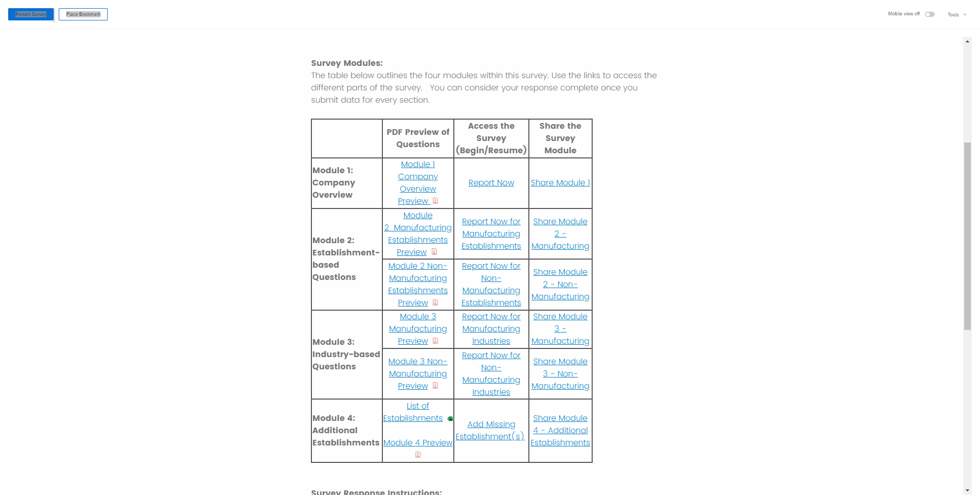 The Phase I instrument was organized into four modules, two of which had submodules that were assigned to companies based on what they do or make. Once a respondent logged into the survey, they were redirected to a rudimentary survey dashboard, shown in Figure 1. Note that the submodules only displayed if they were in-scope for the responding company.