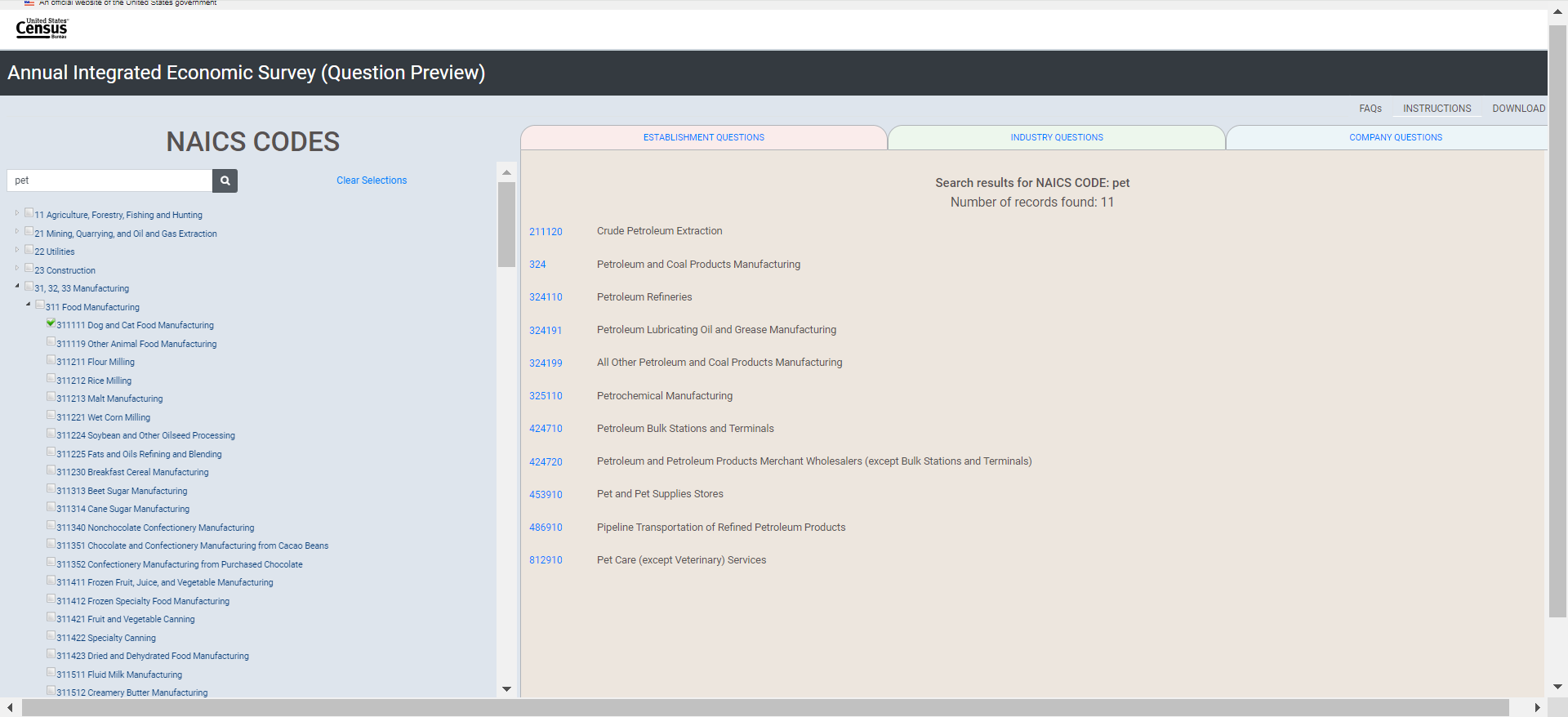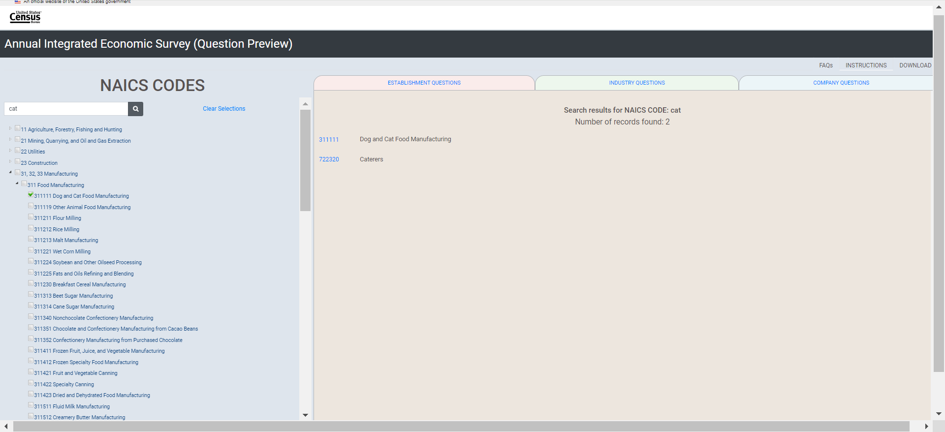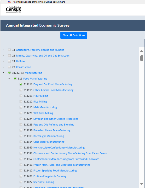 Selecting for 311111 by searching for “cat” (Dog and Cat Food Manufacturing)
