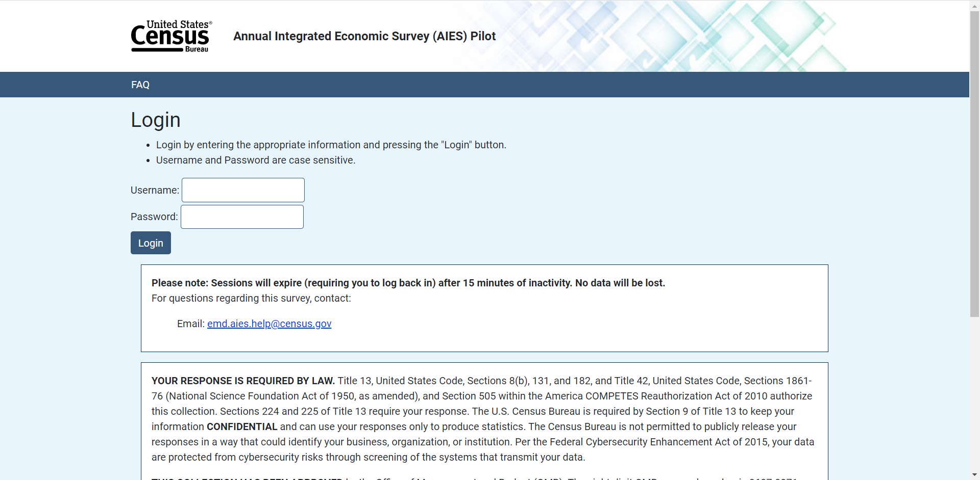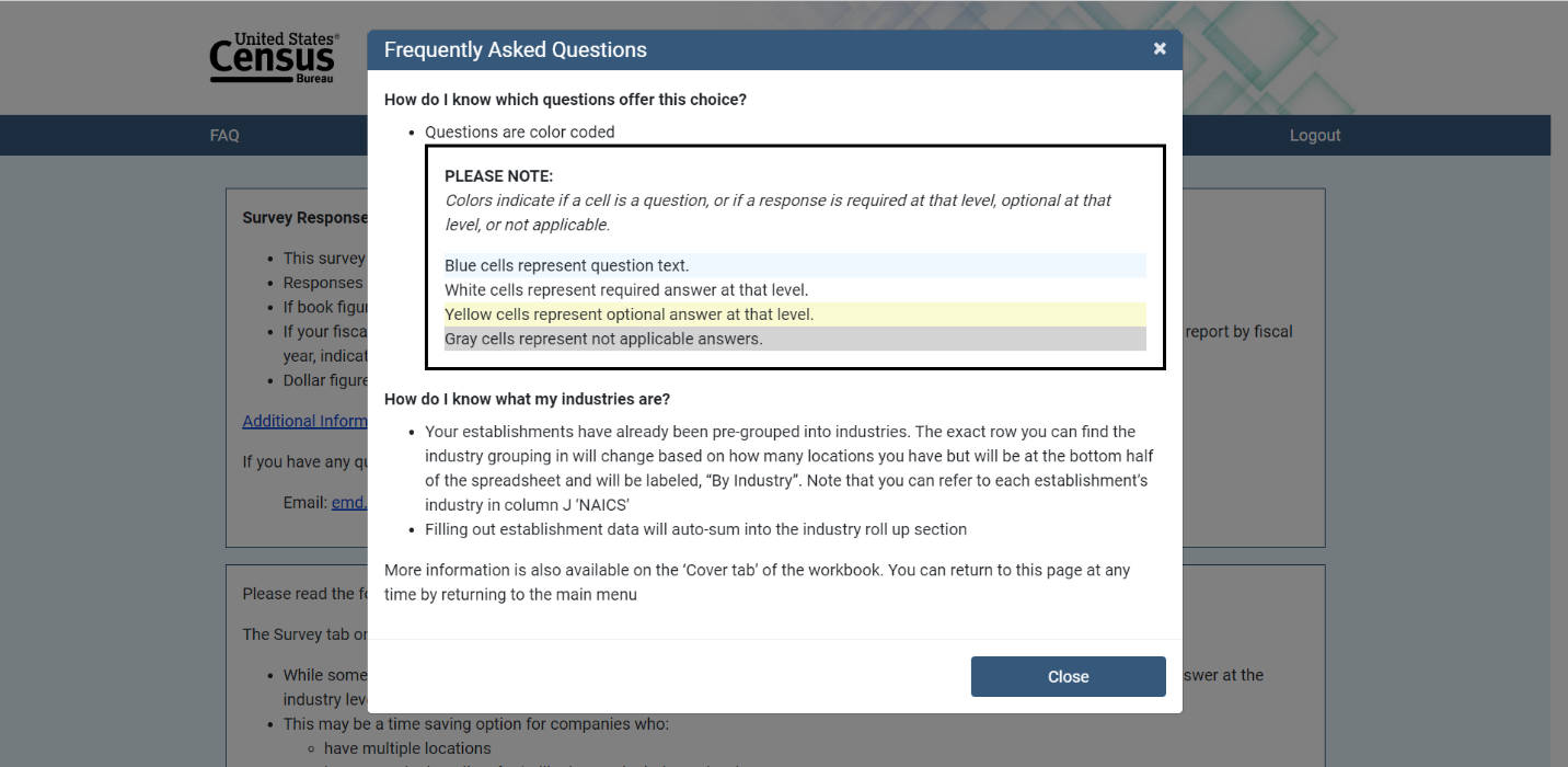 Upon accessing the portal, respondents could access Frequently Asked Questions through a link in the upper left corner of the screen. This brought up an overlay ‘modal’ screen with additional information for response. See Figure 4 for a screenshot of the FAQ overlay screen. The information contained in this overlay screen pertained to providing a response, and was not about any specific questions on the survey instrument. Respondents could also access a PDF document that provided additional response support – again, not the content of the survey, but rather instructions for providing response overall.