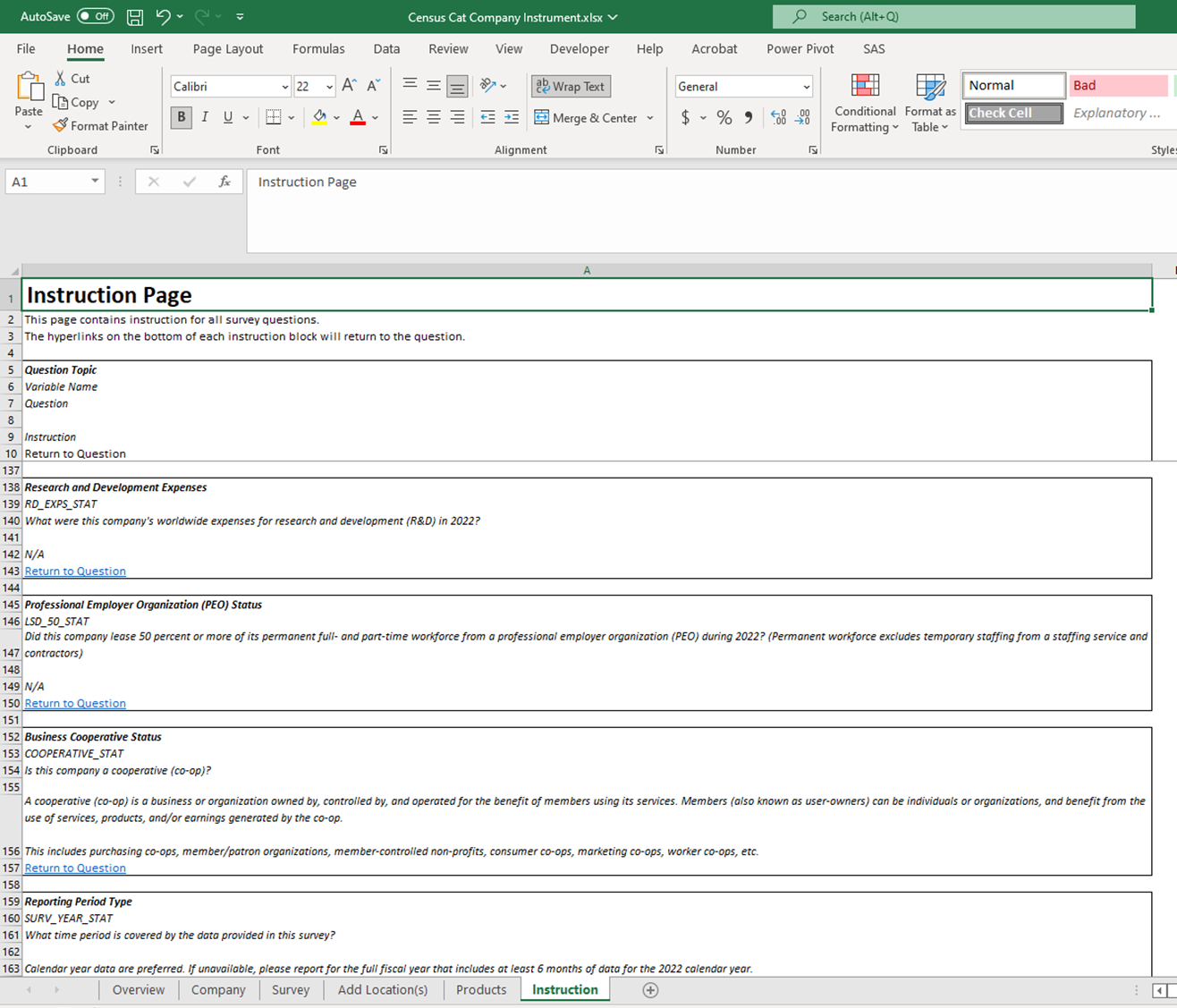 If a respondent clicked on the blue “Instructions” link under any given question, they were automatically directed to that specific question within the “Instructions” tab, where they would see additional information to aid in response, including what to include or exclude in their response, definitions, and other information. See Figure 6 for a screenshot of the Instructions tab. Respondents could then click “Return to Question” within that Instruction Tab to be redirected back to the question within the response spreadsheet.