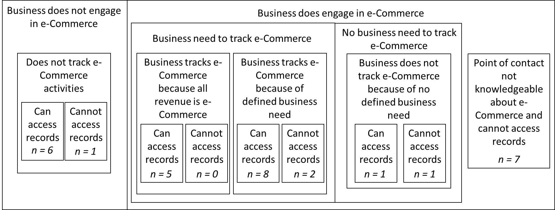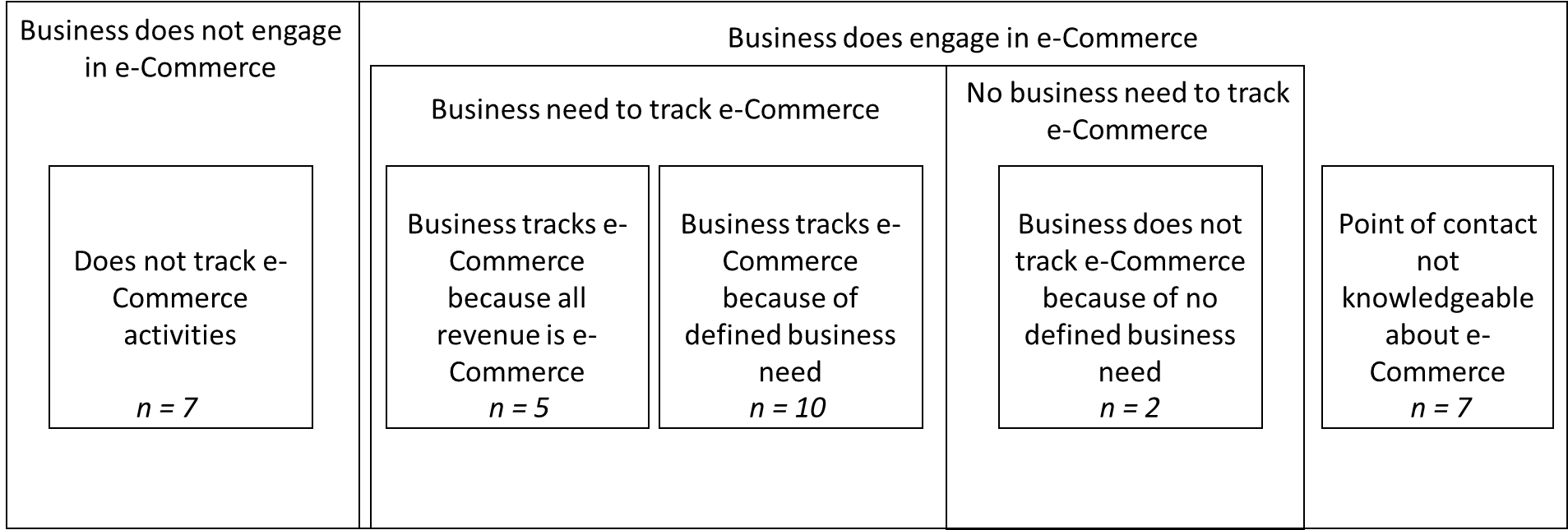 5 These subjective distinctions were made based on the information provided by participants during the interview about the amount of e-Commerce their business conducts, including details about the type of sales and how important the sales are to the business, and how these participants described the volume (such as the quantifiers they used during the discussion).