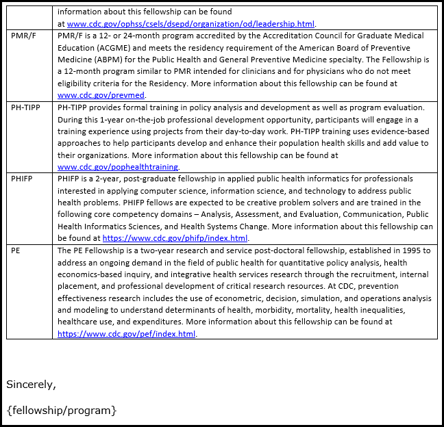 NEW FELLOWSHIP LIST: APHL-CDC Antimicrobial Laboratory Resistance Fellowship APHL-CDC Career Pathways in Public Health Laboratory Science: Public Health Laboratory Fellowship APHL-CDC Environmental Public Health Fellowship APHL-CDC Infectious Diseases Bioinformatics Fellowship Program APHL-CDC Infectious Diseases Laboratory Fellowship APHL-CDC Newborn Screening Bioinformatics and Data Analytics Fellowship Applied Public Health Informatics Fellowship (APHIF) ASA/NCHS Research Fellowship Program ASPPH/CDC Public Health Fellowship Program ASPPH/CDC--Health Education Track Biochemical Markers Fellowship CDC Data Science Upskilling (DSU) Program CDC eLearning Institute (ELI) Fellowship CDC Evaluation Fellowship Program CDC John R. Lewis Undergraduate Public Health Scholars (formerly CUPS) CDC Steven M. Teutsch Prevention Effectiveness Fellowship CDC Summer Graduate Environmental Health (GEH) Internship CDC/ATSDR Branch of OGC Internship and Externship Opportunities CDC/CSTE Applied Epidemiology Fellowship Program CDC-Hubert Global Health Award CDC-Tuskegee University Public Health Ethics Program CSTE Applied Public Health Informatics Fellowship CSTE Data Science Team Training (DSTT) program Dental Public Health Residency DHAP Division of HIV Prevention's Postdoctoral Research Fellowship in HIV Prevention for Communities of Color Directors of Health Promotion and Education (DHPE) Health Equity Fellowship Program Diverse Executives Leading in Public Health (DELPH) Program Emerging Leaders Certificate Program (ILead) Emory Rollins Earn and Learn (REAL) Program Emory/CDC Medical Toxicology Fellowship Program Epidemic Intelligence Service (EIS) Epidemiology Elective Program (EEP) Future Leaders in Infections and Global Health Threats (FLIGHT) Gilstrap OBGYN Fellowship in Sexually Transmitted, Emerging, and Remerging Infectious Disease and Congenital Infections Headquarters Experience and Technical Exchange (HETA) Program Hispanic Association of Colleges and Universities (HACU) National Internship Program (HNIP) Improving Public Health Management in Action (IMPACT) Incident Manager Training and Development Program (IMTDP) Indigenous Public Health Leaders Program Initiative for Leadership Enhancement and Development (ILEAD) International Experience and Technical Assistance (IETA Program) James A. Ferguson Emerging Infectious Diseases (EID) RISE Fellowship Junior Commissioned Officer Student Training and Extern Program (JRCOSTEP) Laboratory Animal Medicine Residency Program (LAMRP) Laboratory Leadership Service (LLS) Leadership Academy Maternal Child Health Careers/Research Initiatives for Student Enhancement – Undergraduate Program (MCHC/RISE-UP) Molecular Epidemiology Fellowship (MEF) Morehouse College Lewis Scholars' IMHOTEP Project National Association of County and City Health Officials (NACCHO) Heath and Disability Program National Center for Health Statistics (NCHS) / AcademyHealth (AH) Health Policy Fellowship National Center for Health Statistics (NCHS) Postdoctoral Research Program National Environmental Public Health Internship Program (NEPHIP) National Leadership Academy for the Public's Health NIOSH Occupational Medicine Rotation Oak Ridge Institute for Scientific Education (ORISE) fellowship Pacific Public Health Fellows Program (PPHFP) Persons with Disabilities Career Development Internship Program PHI/CDC Global Health Fellowship Program Population Health Training in Place Program (PH-TIPP) Presidential Management Fellows (PMF) Preventive Medicine Residency and Fellowship (PMR/F) Professional Performance Program (P3) Public Health AmeriCorps Public Health Associate Program for Recent Graduates (PHAP) (PHAP) Public Health Emergency Management Fellowship (PHEM) Public Health Entomology for All (PHEFA) Public Health Informatics Fellowship Program (PHIFP) Public Health Law Fellowship Science Ambassador Fellowship (SAF) Senior Commissioned Officer Student Training and Extern Program (SRCOSTEP) Skill Enhancement and Employee Development (SEED) Skills, Talents, Abilities and Results Training (START) SOAR Mentorship Program SOPHE/CDC Student Fellowship in Injury Prevention and Control Thurgood Marshall College Foundation Student Ambassador Program Tribal Public Health Law Internships and Externships Other