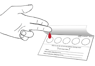 Open blood card flap to expose the circles on the blood collection paper. Do not touch the blood collection paper (i.e., circles).