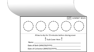 When blood collection paper is dry, close blood card by tucking flap. Place the blood card and lancets into biohazard bag with the desiccant pack. Ensure biohazard bag is properly sealed.