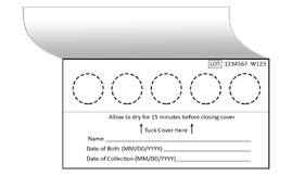 Open blood card flap to expose the circles on the blood collection paper. Do not touch the blood collection paper (i.e., circles).