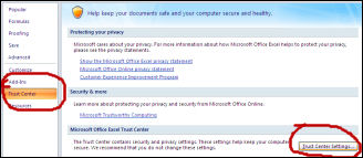 | 3. In the "Excel Options" window that appears, click the TRUST CENTER button on the left. |