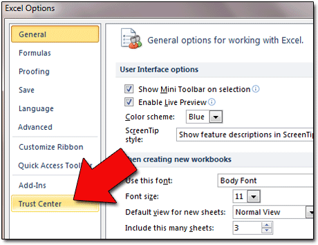 | 3. In the "Excel Options" window that appears, scan the left menu and click TRUST CENTER. |