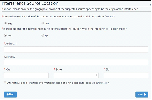 Selecting “No” will enable to user to move forward to the next section of the form. Selecting “Yes” will prompt the user another question about whether the location of the interference source is different from the location where the interference is experienced.