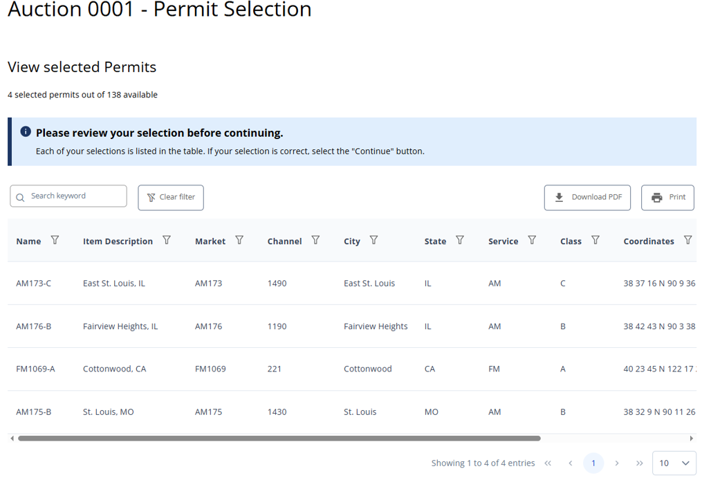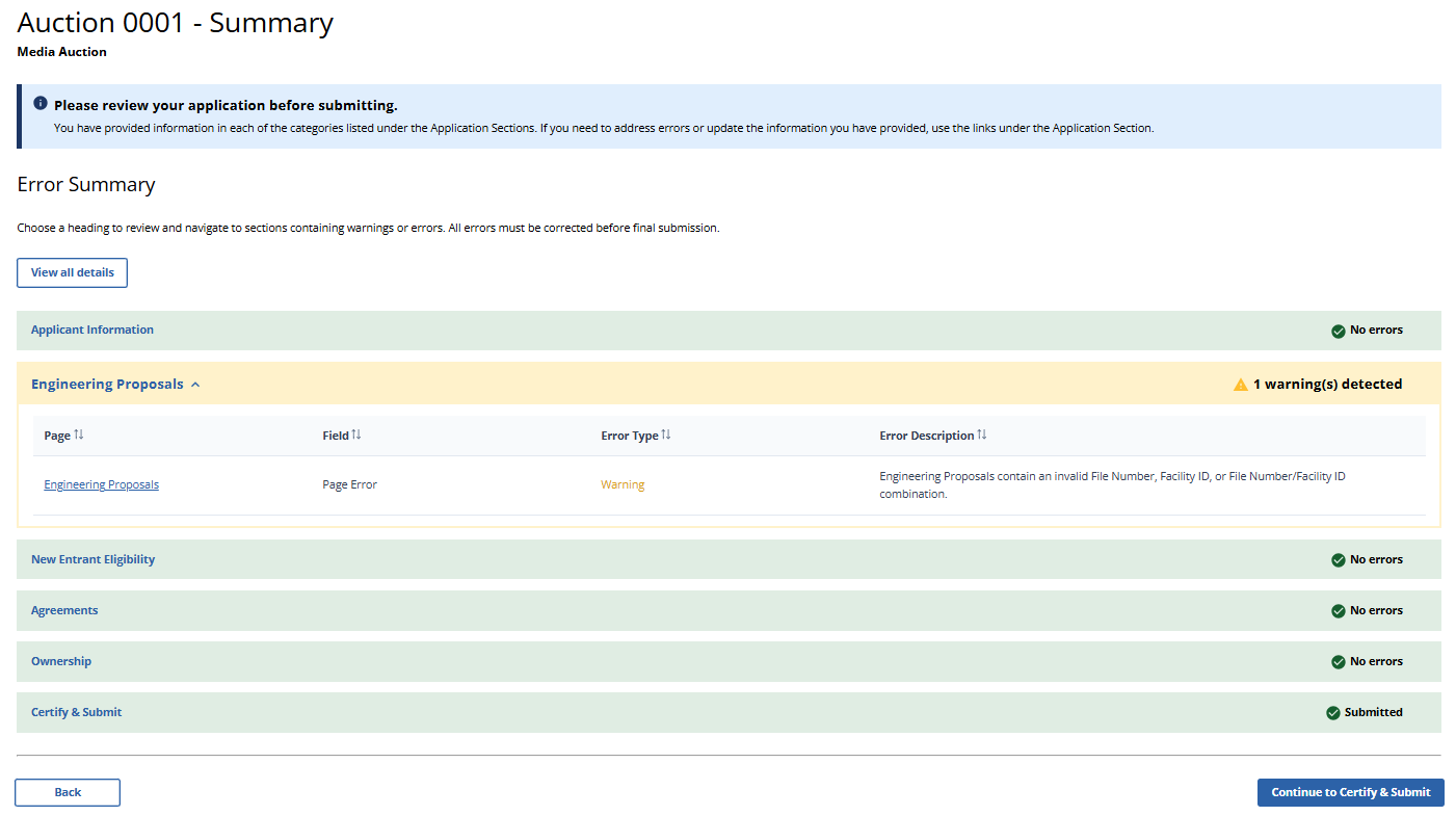 (Error Summary With No Errors Detected as Displayed to Broadcast Table Service Auction Applicants)