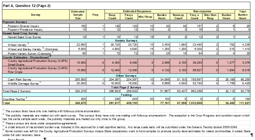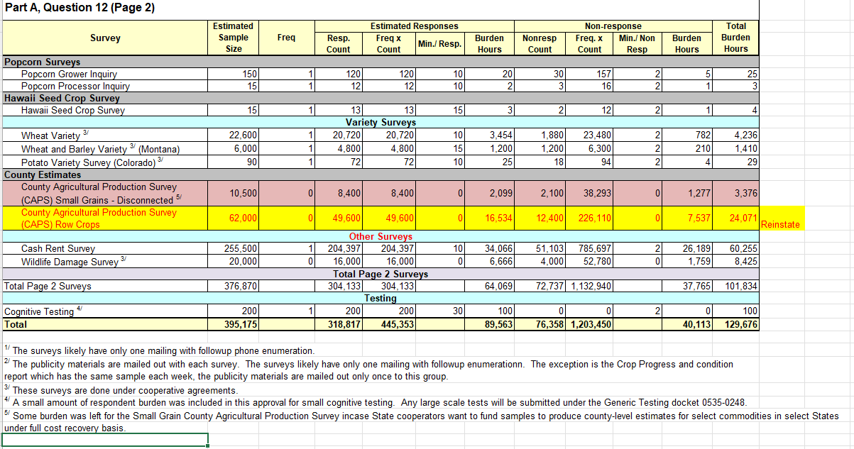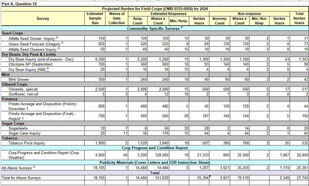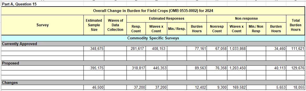 The Row Crop County Estimate Survey for Crop Year 2024 has been reinstated following a previous decision to discontinue it. This non-substantive change will reinstate the survey. The total burden for the Row Crop County Estimate Survey has been adjusted back to the OMB-approved hours of September 25th, 2023, which were 24,071 hours. The Annual Cost to the Federal Government has been adjusted to $11.85 million. Additionally, the total burden hours for the ICR will be increased to 129,676 from 111,621. However, the approved questionnaire content will remain unchanged.